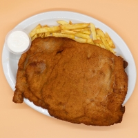 Choquito entero a la PlanchaAcompañado de patatas fritas y salsa verde |